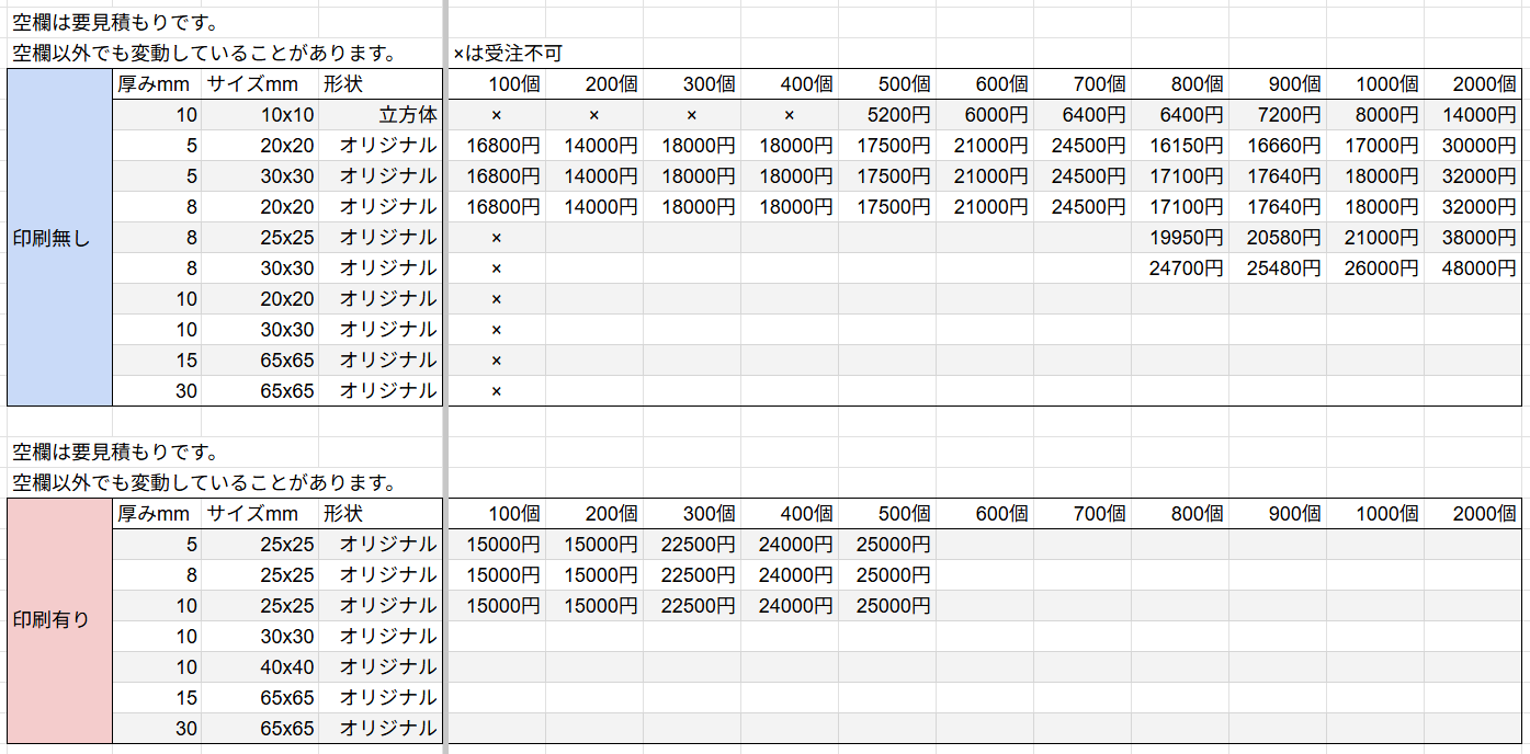 ・人型の駒500個+ウサギ型の駒500個は、見積もり表で合計して1000個の箇所ではなく、それぞれが500個の箇所の金額になります。