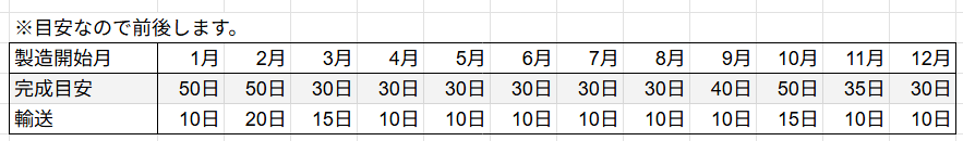 製造には以下の表の時間がかかります。